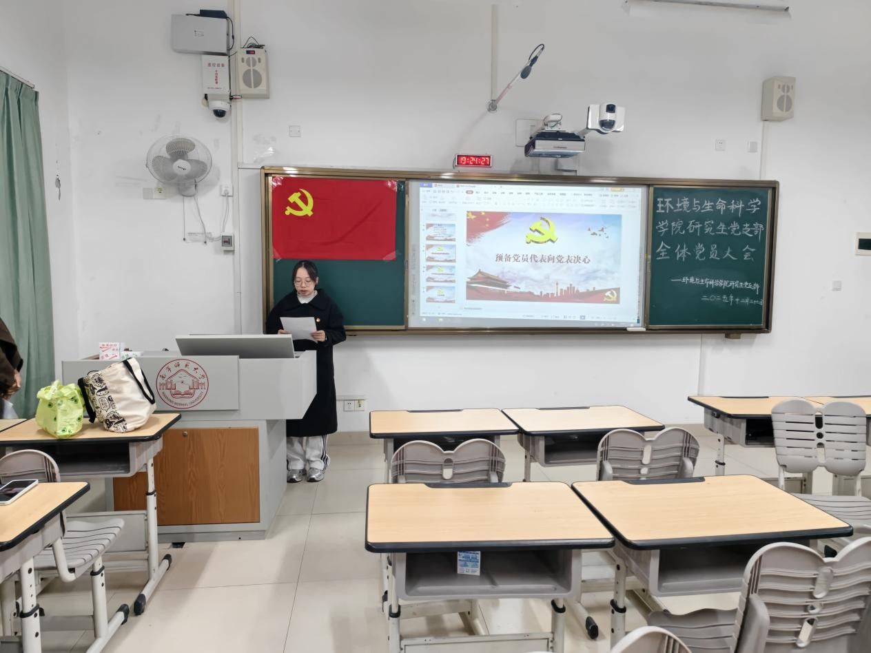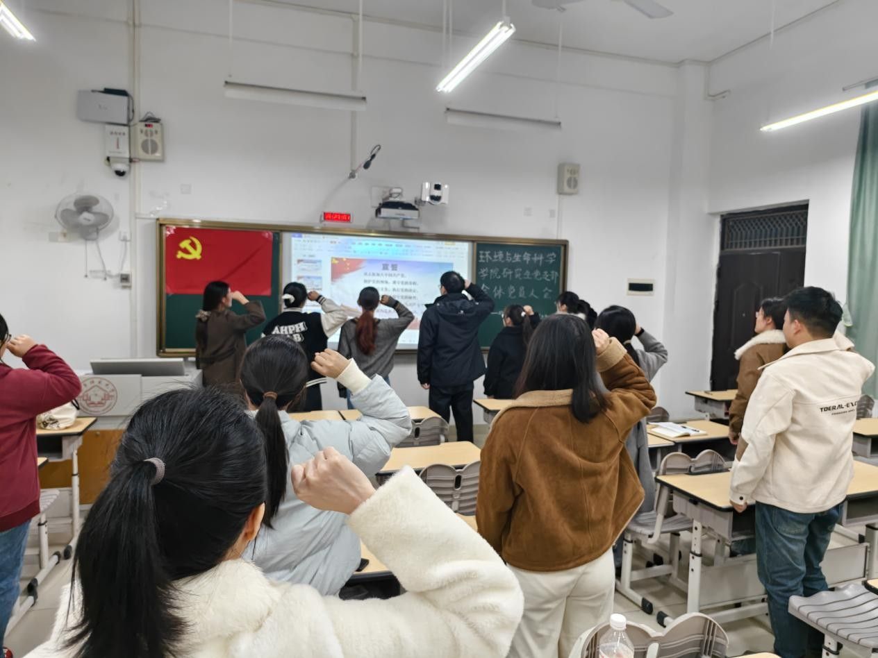 研究生党支部于2025年12月26日晚在武鸣校区1号教学楼102教室召开预备党员宣誓大会。会议由研究生党支部书记卢恩敏主持,全体党员参与。