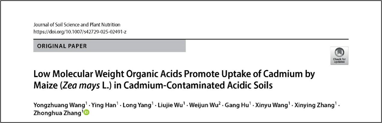 团队成员王永壮教授等在Journal of Soil Science and Plant Nutrition发表题为“Low molecular weight organic acids promote uptake of cadmium by Maize (Zea maysL.) in cadmium-contaminated acidic soils”的研究论文。该研究深入探讨了低分子量有机酸在镉污染酸性土壤中对镉形态转化的影响及其对玉米吸收镉过程的促进机制,研究成果为发展农田镉污染植物修复技术提供了重要的理论支撑。