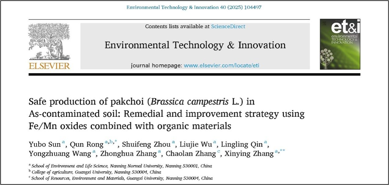 研究生孙宇博在容群副教授和张新英教授的指导下在Environmental Technology & Innovation发表题为“Safe production of pakchoi (Brassica campestrisL.) in As-contaminated soil: Remedial and improvement strategy using Fe/Mn oxides combined with organic materials”的研究论文。该研究创新性制备了铁锰氧化物,并联合有机材料对砷污染土壤进行修复和改良,从配位络合与功能基因角度阐明了修复和改良的机制,实现了污染耕地质量提升,为重金属污染农田土壤的安全利用提供了新的技术路径。
