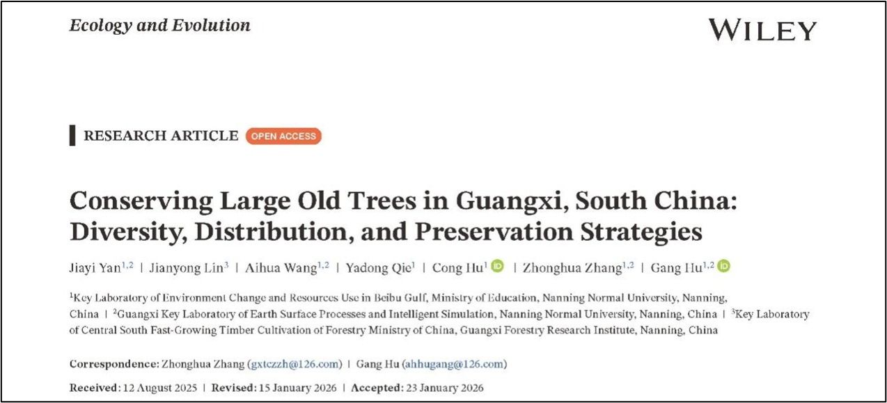 研究生严嘉怡在张忠华教授和胡刚教授的指导下在Ecology and Evolution发表题为“Conserving large old trees in Guangxi, South China: Diversity, distribution, and preservation strategies”的研究论文。该研究查清了广西区内树龄500年以上古树的物种组成、空间分布格局及丰富度热点区域,明晰了自然环境和人文社会经济因素对古树分布的潜在驱动机制。本研究为广西科学制定古树保护策略以及传承生态文化遗产提供了决策依据。