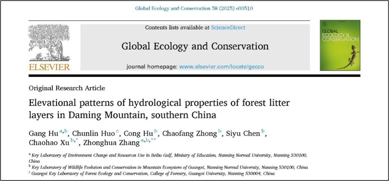 团队成员胡刚教授等在Global Ecology and Conservation发表题为“Elevational patterns of hydrological properties of forest litter layers in Daming Mountain, southern China”的学术论文。该研究以广西大明山300-1400m海拔梯度内森林监测样地为对象,系统揭示了森林凋落物层水文特性随海拔梯度的变化规律,并解析了其与温度、NDVI等关键环境因子的关联机制。研究成果为亚热带山地森林水源涵养功能的评估提供了科学依据。