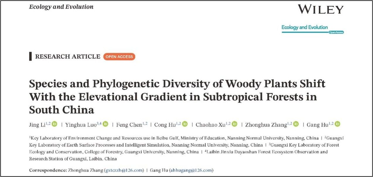 研究生李晶在张忠华教授和胡刚教授的指导下在Ecology and Evolution发表题为“Species and phylogenetic diversity of woody plants shift with the elevational gradient in subtropical forests in South China”的研究论文。该研究沿大明山海拔梯度建立了24个森林监测样地,系统分析了木本植物物种多样性和系统发育多样性沿海拔梯度的变化格局及其驱动因素。该研究深化了对亚热带山地植物多样性分布规律的认识。