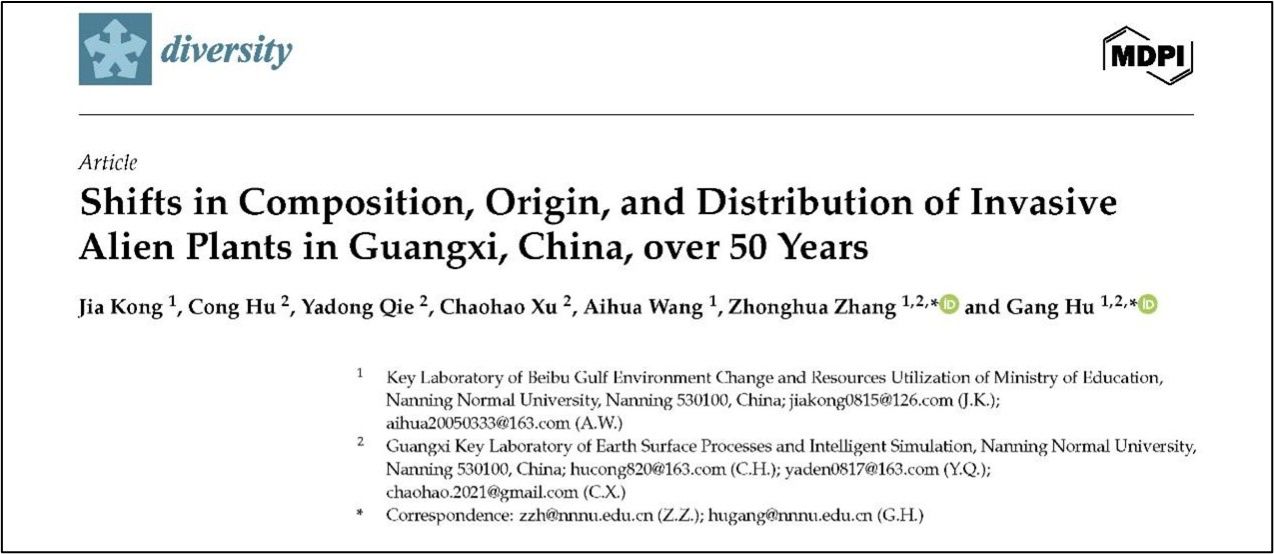 研究生孔嘉在张忠华教授和胡刚教授的指导下在Diversity发表题为“Shifts in composition, origin, and distribution of invasive alien plants in Guangxi, China, over 50 years”的研究论文。该研究揭示了广西半个世纪以来(1973—2023年)外来入侵植物在物种组成、来源地及地理分布格局上的动态变化趋势,明确了人类活动与气候变化是驱动其动态演变的重要因素。该成果为广西开展外来入侵植物的早期预警、动态监测及综合治理提供了基础信息与科学决策依据。