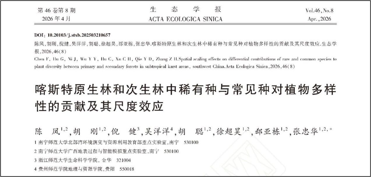 研究生陈凤在张忠华教授指导下在《生态学报》发表题为“喀斯特原生林和次生林中稀有种与常见种对植物多样性的贡献及其尺度效应”的研究论文。该文比较了喀斯特原生林与次生林中木本植物稀有种和常见种对群落物种与系统发育多样性的贡献。该研究为认识喀斯特植物多样性维持机制以及评估森林恢复状态提供了科学依据。