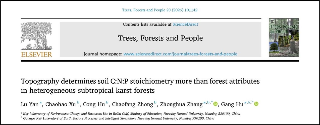 研究生严露在张忠华教授和胡刚教授的指导下在Trees, Forests and People发表题为“Topography determines soil C:N:P stoichiometry more than forest attributes in heterogeneous subtropical karst forests”的研究论文。该研究以中亚热带喀斯特常绿‑落叶阔叶混交林为对象,系统分析了地形因子(如坡位、岩石裸露率等)与林分结构属性对土壤碳、氮、磷化学计量特征的影响,结果表明地形因子的驱动作用显著强于林分属性。这一发现为深入理解喀斯特异质性生境中土壤养分循环的调控机制提供了新的科学视角。