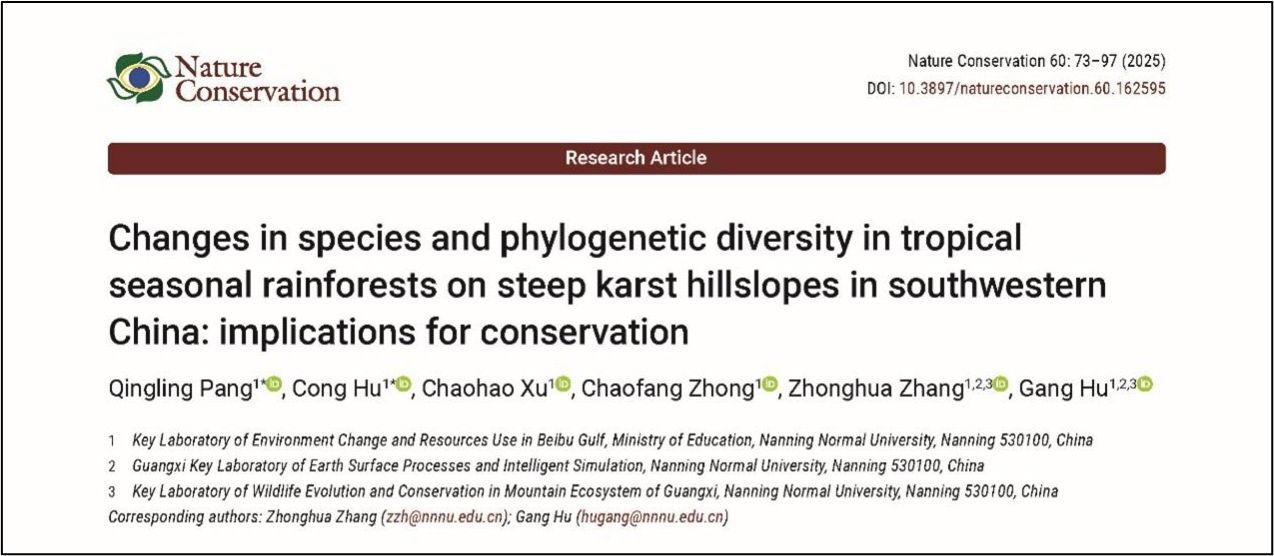 研究生庞庆玲在张忠华教授和胡刚教授的指导下在Nature Conservation发表题为“Changes in species and phylogenetic diversity in tropical seasonal rainforests on steep karst hillslopes in southwestern China: implications for conservation”的研究论文。该研究聚焦喀斯特峰丛洼地中分布的北热带季节性雨林,系统阐明了物种多样性与系统发育多样性沿坡位梯度的变化格局,揭示了地形因子驱动喀斯特森林群落多样性维持的相对作用。研究成果为喀斯特地区生物多样性保护与生态系统管理提供了理论依据与科学指导。