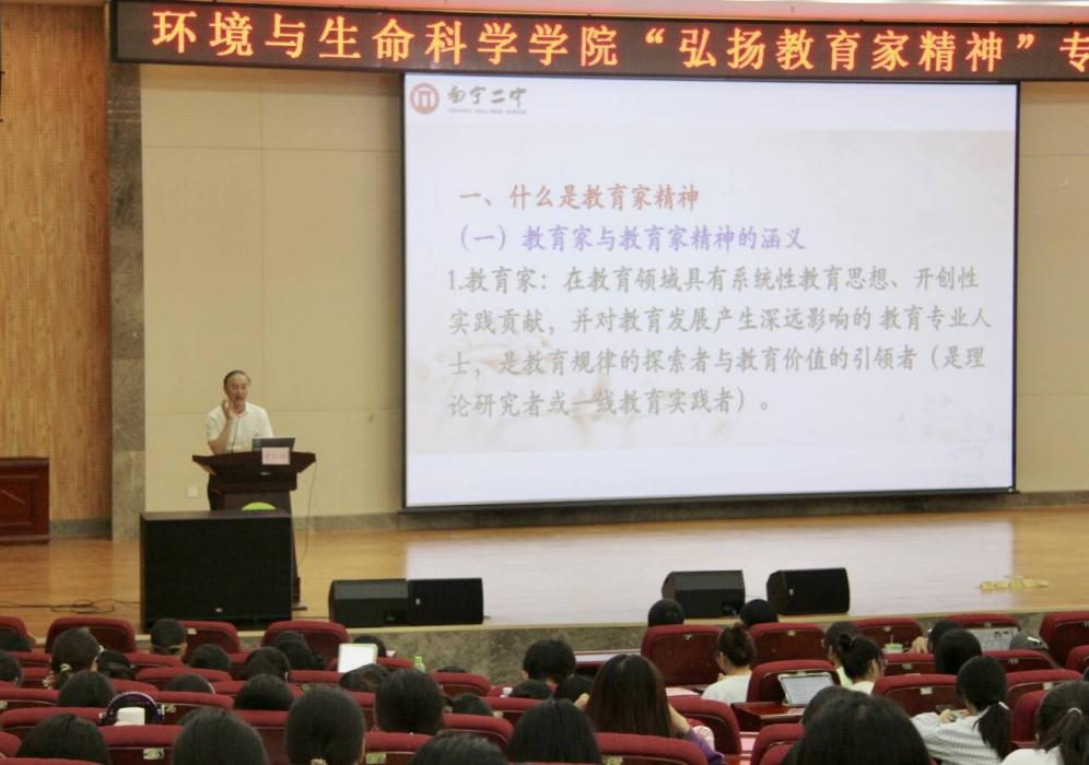 于7月4日在武鸣校区图书馆报告厅举办“弘扬教育家精神”专题讲座,本次讲座特邀南宁市第二中学校长黄幼岩担任主讲嘉宾。学院院长何英姿、教师李鹏、学科教学(生物)专业研究生及生物科学(师范类)本科生共同聆听了这场关于教育理念与精神传承的精彩讲座。