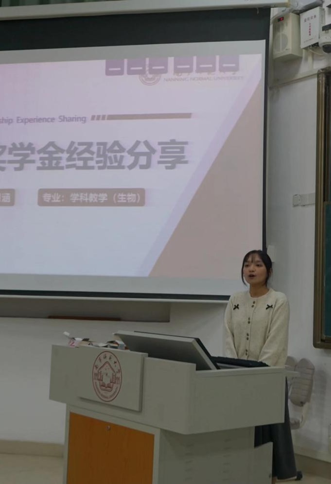 刘涵同学围绕“专业能力与科研创新能力协同提升”主题,分享了其在“田家炳杯”师范技能大赛(校级一等奖)、中国国际大学生创新大赛(省级奖项)中的备赛逻辑、成果转化思路与团队协作经验,鼓励研究生主动参与高水平学术竞赛与科研实践项目;