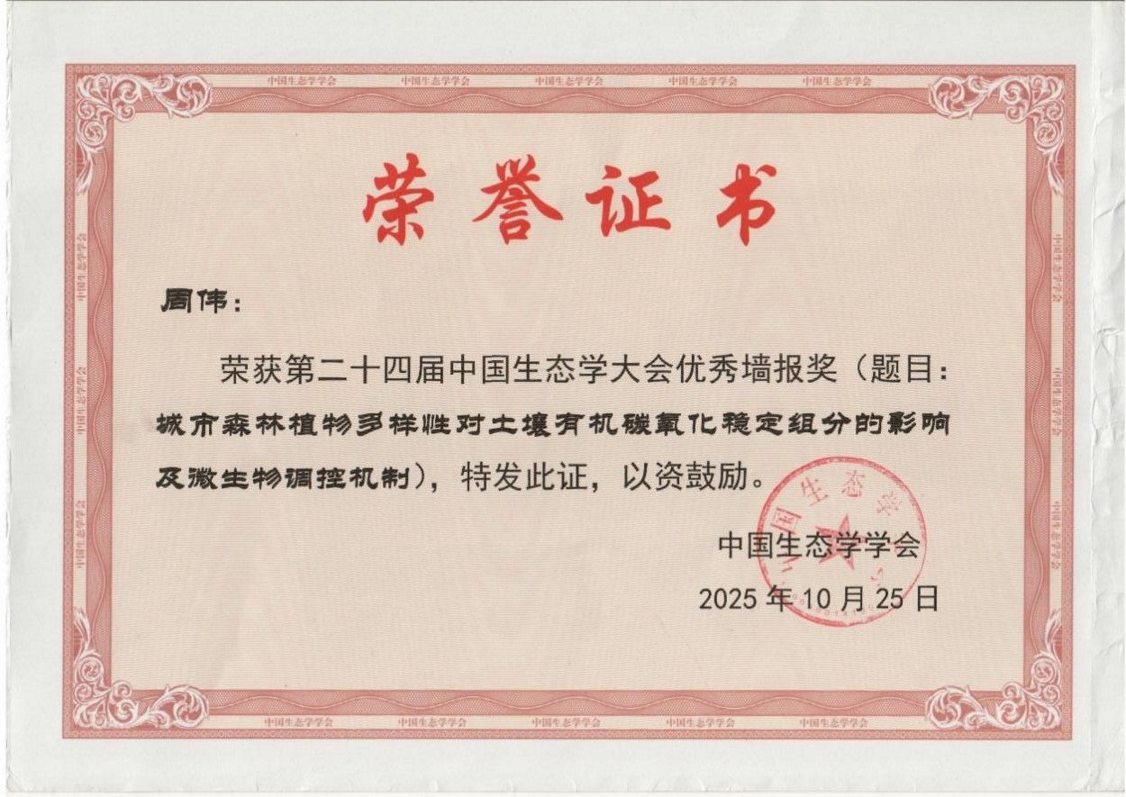 两位同学分别依托立项的国家级、自治区级大学生创新创业训练计划项目,在周伟老师的悉心指导下,围绕城市森林土壤固碳功能及其微生物驱动机制这一前沿主题,完成了从实验设计到数据分析的科研训练,取得初步创新成果。此次获奖既是对学生个人科研潜力与专业素养的肯定,也彰显了十大线上棒球下注网站