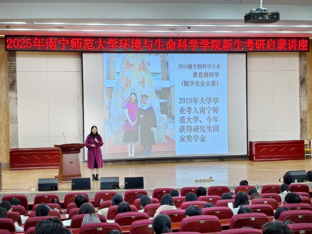 于武鸣校区图书馆报告厅举办2025级新生考研启蒙讲座。本次讲座由学院院长何英姿教授担任主讲,辅导员甘佩萍、骆亮城及2025级全体大一学生参加。