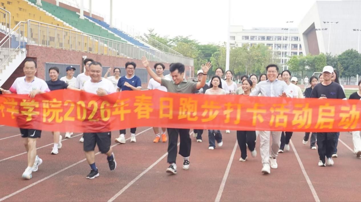 于2026年4月7日下午,在武鸣校区松园田径场举行“春风十里,不如跑起”春日跑步打卡活动启动仪式。学院党委书记韦东林、党委副书记刘启满、周伟老师及辅导员骆亮城、甘佩萍出席活动,学院团委、学生会、新媒体中心代表及五十余名运动爱好者积极参与,大家以奔跑健行的方式,共赴一场春日与运动的美好之约。